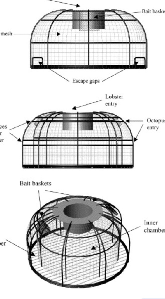 A plastic grate, about a 30” diameter disc for a base, in the center a small removable cage (kitchen) designed to hold the bait, usually cat food, sometimes fish guts, or everyone’s favorite abalone guts… mounted to the perimeter of the base was a sort of dome/cage which formed the volume of the trap (the parlor). At the top of the dome cage was a passage approximately six inches in diameter, this was lined with long flexible plastic prongs that faced inwards. Think of the tire spikes that allow you to drive into a parking lot, but cause severe tire damage if you try to back out.